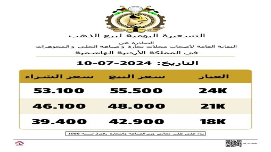 وحسب النشرة اليومية التي أصدرتها النقابة العامة لأصحاب محلات تجارة وصياغة الحلي والمجوهرات، بلغ سعر الغرام الواحد من الذهب عياري 24 و18 لغايات البيع من محلات الصاغة 55.5 و42.9 دينارا على التوالي.