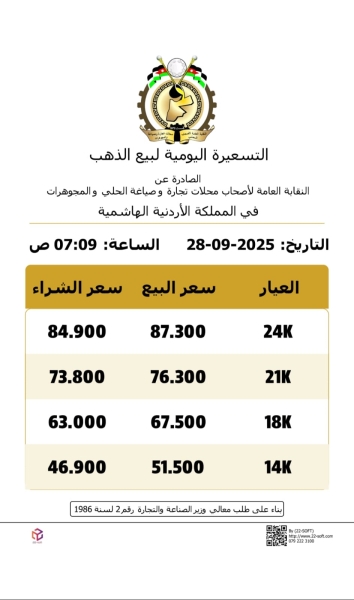 وحسب النشرة اليومية التي أصدرتها النقابة العامة لأصحاب محالّ تجارة وصياغة الحلي والمجوهرات، بلغ سعر الغرام الواحد من الذهب عيارات 24 و18 و14 لغايات البيع من محالّ الصاغة 87.30 67.50 و51.50 دينارا على الترتيب.