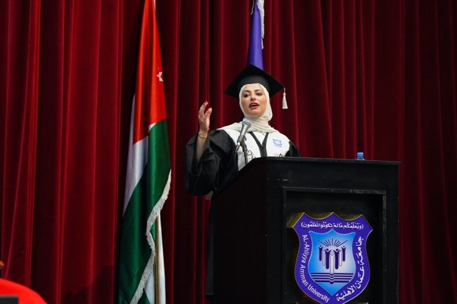ثم قالت : إِنَّهُ لِمِنْ دَوَاعِي فَخْرِي وَإِعْزَازِي أَنْ أَقِفَ اليَوْمَ أَمَامَكُمْ تَحْتَ سَمَاءِ جَامِعَتِي، جَامِعَةِ عَمَّانَ الأَهْلِيَّةِ، أَصَالَةً عَنْ نَفْسِي، وَنِيَابَةً عَنْ زُمَلَائِي، لِأُشَارِكَكُمْ هَذِهِ اللَّحْظَةَ الاِسْتِثْنَائِيَّةَ.