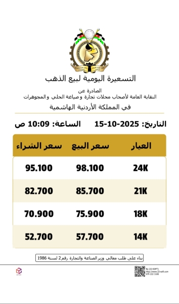 ووفقا للنشرة اليومية الصادرة عن النقابة العامة لأصحاب محلات تجارة وصياغة الحلي والمجوهرات، ارتفع سعر الغرام الواحد من الذهب لعيارات 24 و18 و14 إلى 98.1 دينارا و75.9 دينارا و57.7 دينارا على التوالي، لغايات البيع من محلات الصياغة.
