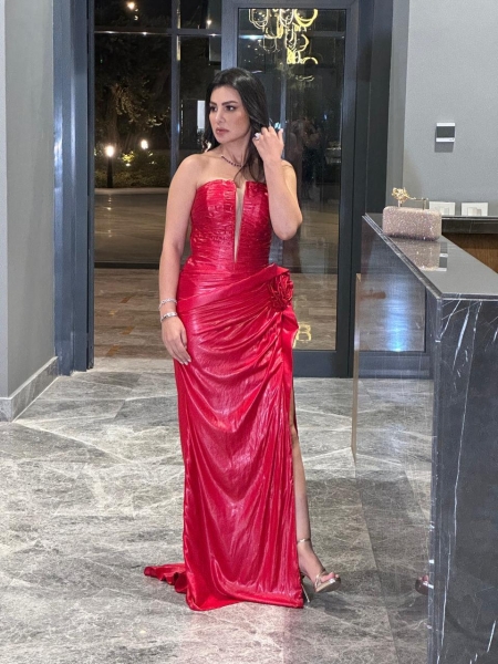 جاء اختيار دينا مميزا، اختارت فستان جريء في تصميمه، يجمع بين خامتين متناقضين، وهما المخمل القوي الجريء ويزيد من جرأته تصميم الكورسيه الواضح، وفي الجزء السفلي، جاءت خامة الشبك المطرز بكريستالات التي تتميز بالنعومة والأنوثه، مما يضيف للإطلالة قوة وجاذبية.