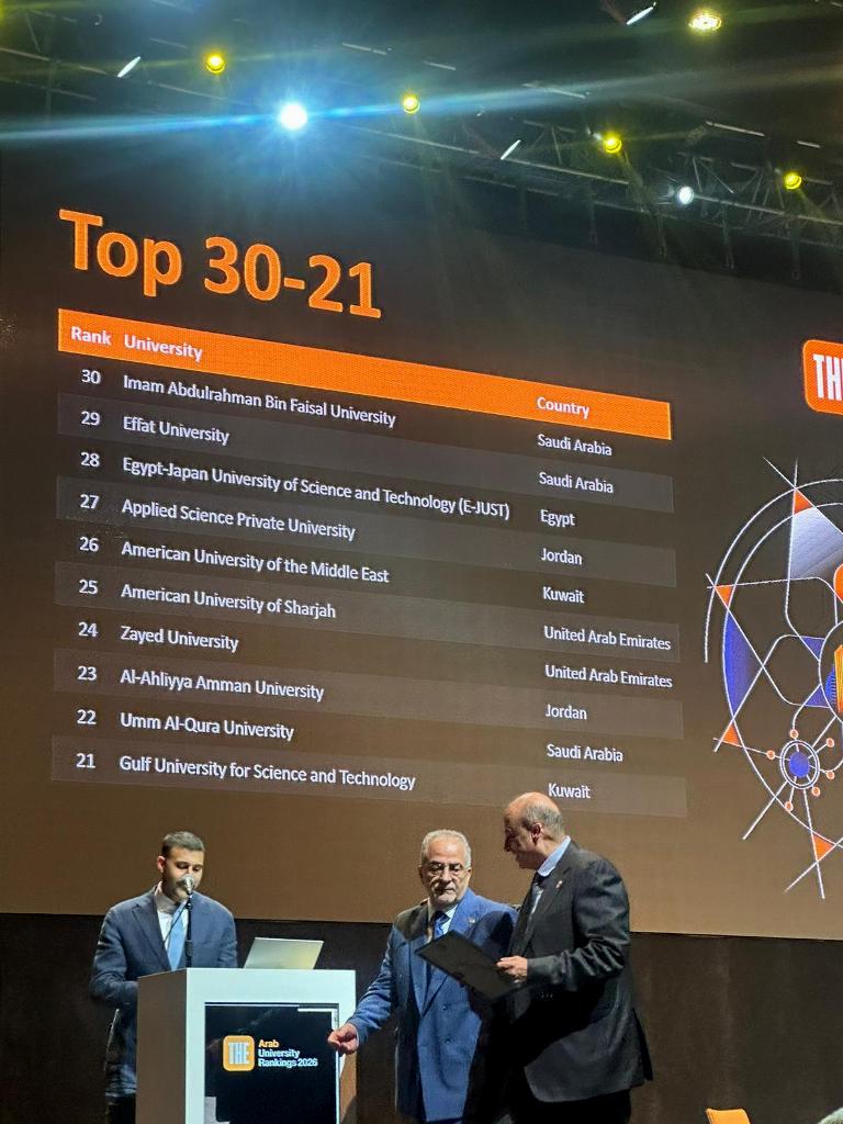 أعلنت مساء امس مع اختتام فعاليات اليوم الثاني لقمةتصنيف التايمز العربي 2025 نتائج تصنيف التايمز العربي 2025 ( من 21- 30) وذلك على هامش أعمال قمة التايمز للجامعات العربية التي استضافتها جامعة عمّان الأهليّة بالشراكة مع الجامعة الأردنية، والتي تُعقد لأول مرة في الأردن بمشاركة واسعة من ممثلي الجامعات العربية وخبراء التصنيفات العالمية.
