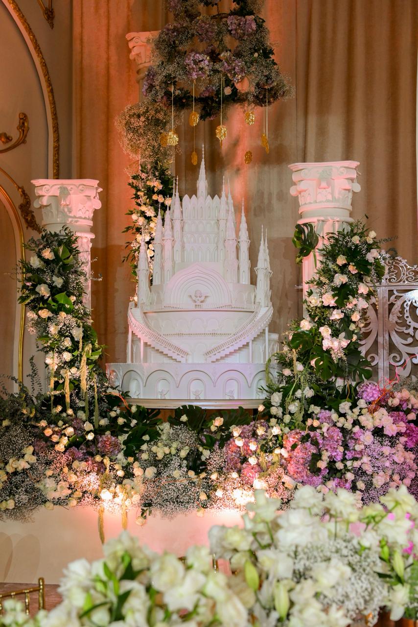 ومن بين مفاجآت السهرة، قدّم آدم عفارة ما وُصف بـ أكبر كيكة زفاف في العراق، بتصميم قصر ملكي فاخر بقطر 180 سم وارتفاع يصل إلى 3 أمتار، زيّنته الورود الطبيعية والملائكة والسلالم الحلزونية، ليشكّل محوراً بصرياً مبهراً في قلب القاعة.