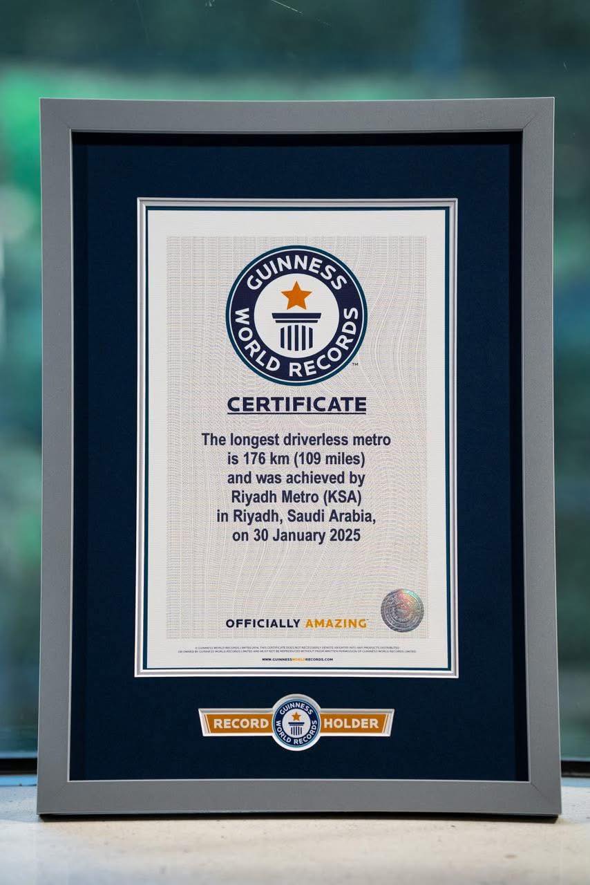 ضمن إنجاز سعودي يضاف إلى قائمة الإنجازات، سجَّل قطار الرياض إنجازًا عالميًا، بعد اعتماده رسميًا في موسوعة "غينيس للأرقام القياسية" بوصفه أطول شبكة قطار ذاتية القيادة بالكامل في العالم -دون سائق-، بطول 176 كيلومترًا؛ في خطوة تعكس التقدُّم المتسارع الذي حققته المملكة في مجال تطوير أنظمة النقل الحديثة والمستدامة.