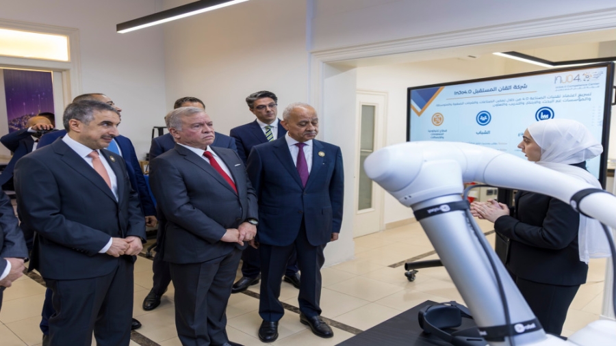 وزار جلالة الملك مركز الابتكار الأردني للثورة الصناعية الرابعة (InJo4.0) في مقر غرفة الصناعة، واستمع إلى شرح من المهندسة دانا قدع عن المركز الذي يهدف إلى تسريع تبني الحلول الرقمية والتكنولوجية في القطاع الصناعي لرفع الإنتاجية وتعزيز التنافسية.