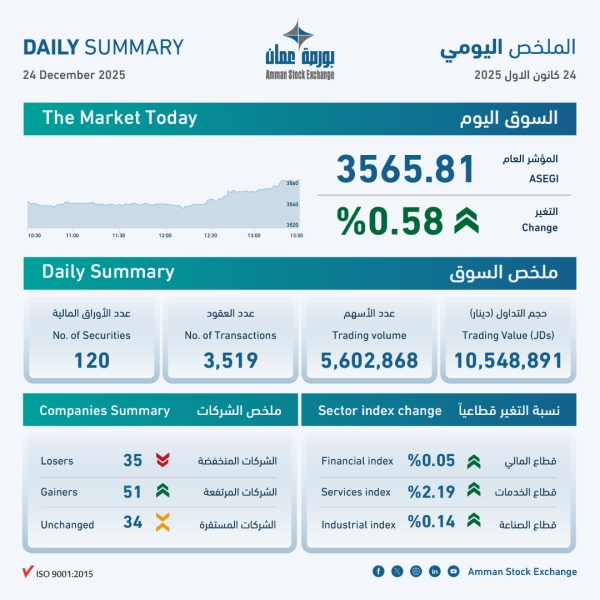 وعن مستويات الأسعار، فقد ارتفع الرقم القياسي العام لأسعار الأسهم إلى 3565 نقطة، بارتفاع نسبته 0.58 بالمئة.