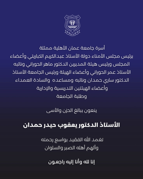 أسرة جامعة عمان الأهلية ممثلة ،برئيس مجلس الأمناء دولة الأستاذ عبد الكريم الكباريتي وأعضاء المجلس،ورئيس هيئة المديرين الدكتور ماهر الحوراني ونائبه الأستاذ عمر الحوراني وأعضاء الهيئة،ورئيس الجامعة الأستاذ الدكتور ساري حمدان ،ونائبه ومساعده والسادة العمداءوأعضاء الهيئتين التدريسية والإدارية، وطلبة الجامعة،ينعون ببالغ الحزن والأسى،المرحوم الأستاذ الدكتور يعقوب حيدر حمدان،تغمد الله الفقيد بواسع رحمتهوألهم أهله الصبر والسلوان.