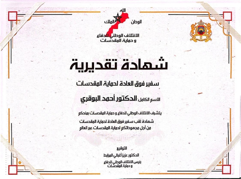 وفي هذه الدورة أيضا منح رئيس لائتلاف الوطني للدفاع وحماية المقدسات، الدكتور عزيز أغبالي المرابط قام ايضا بتوشيح الدكتور أحمد البوقري بلقب سفير فوق العادة لحماية المقدسات.وذلك من أجل المجهودات التي قام بها لحماية المقدسات عبر العالم.