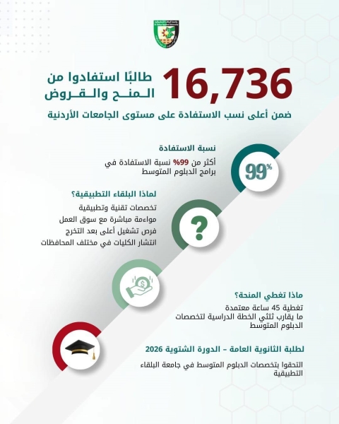 سجلت جامعة البلقاء التطبيقية واحدة من أعلى نسب الاستفادة لطلبتها من المنح والقروض على مستوى الجامعات الأردنية، لاسيما في برامج الدرجة الجامعية المتوسطة (الدبلوم المتوسط) في إنجاز يعكس ريادتها الوطنية في التعليم التطبيقي والتقني.