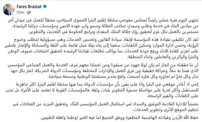أعلن رئيس مجلس مفوضي سلطة إقليم البترا التنموي السياحي فارس بريزات انتهاء فترة عمله في موقعه.