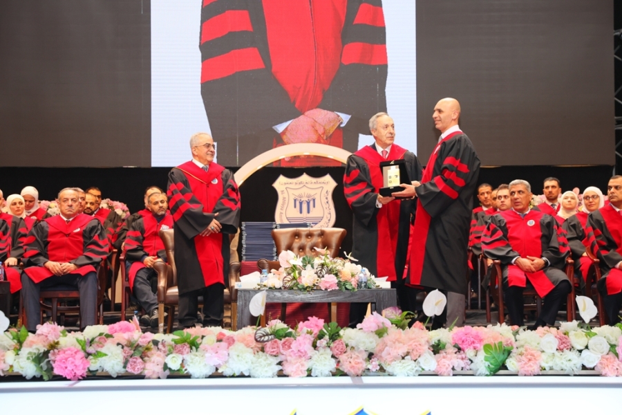 •ثم قام راعي الحفل والى جانبه رئيس الجامعة بتكريم الدكتور مراد المعايطة، تقديرًا لتميّزه في مجال البحث العلمي وإسهاماته القيمة في خدمة المسيرة الأكاديمية.
