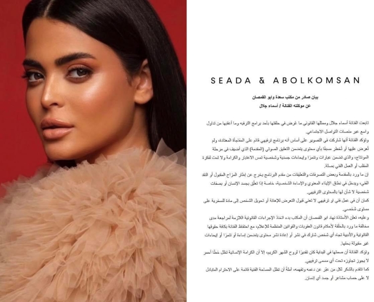 جاء في البيان الصادر عبر الحساب الرسمي للمحامية على موقع "فيسبوك"، أنه بيان صادر عن مكتب "سعدة وأبو القمصان" بشأن موكلته الفنانة أسماء جلال، مؤكدًا أن الفنانة وممثلها القانوني تابعا ما عُرض في حلقتها بأحد برامج الترفيه، إضافة إلى ما أعقب ذلك من تداول واسع للحلقة عبر منصات التواصل الاجتماعي.