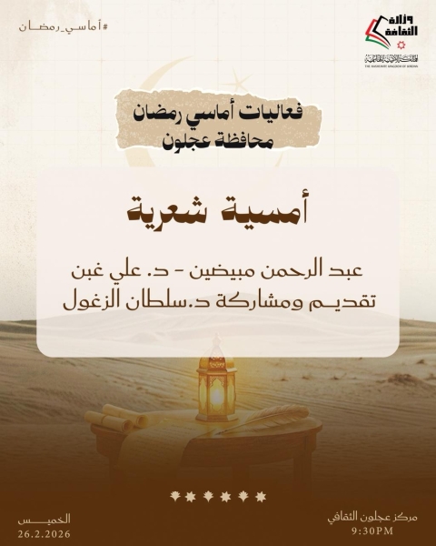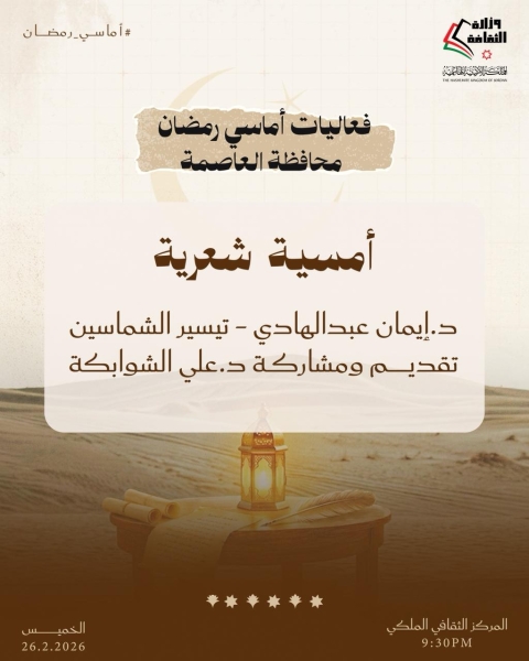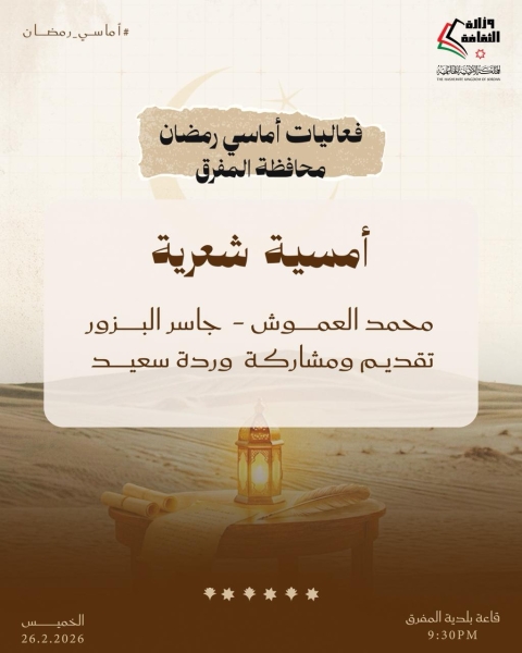 ويأتي البرنامج ضمن توجه الوزارة لتوزيع الفعاليات الثقافية على مختلف المحافظات، وبما يتيح للجمهور المشاركة في أنشطة رمضانية تعزز حضور الثقافة في الحياة العامة.