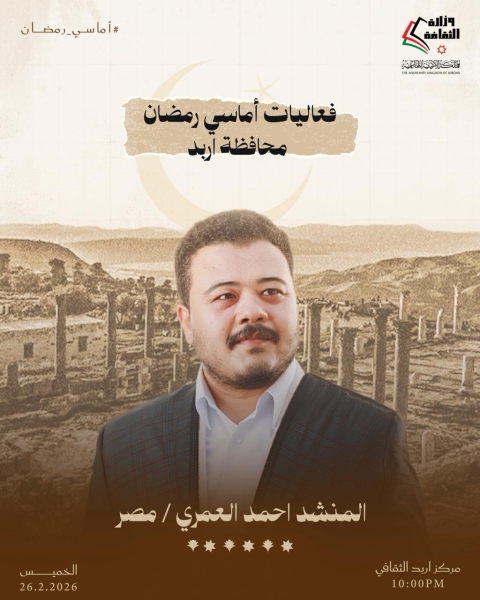 وفي محافظة إربد، فيحيي المنشد المصري أحمد العمري أمسية إنشادية عند العاشرة مساء على مسرح مركز إربد الثقافي.