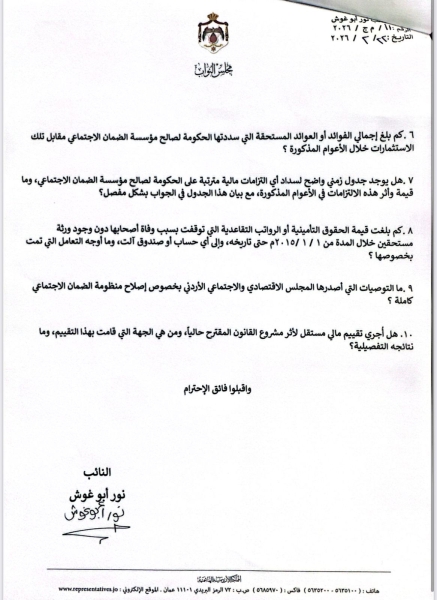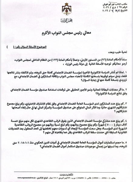 وشمل السؤال الاستفسار عن التوصيات التي أصدرها "المجلس الاقتصادي والاجتماعي الأردني” بشأن إصلاح منظومة الضمان الاجتماعي كاملة، إضافة إلى ما إذا كان قد أُجري تقييم مالي مستقل لأثر مشروع القانون المقترح حاليًا، والجهة التي قامت بهذا التقييم، ونتائجه التفصيلية.
