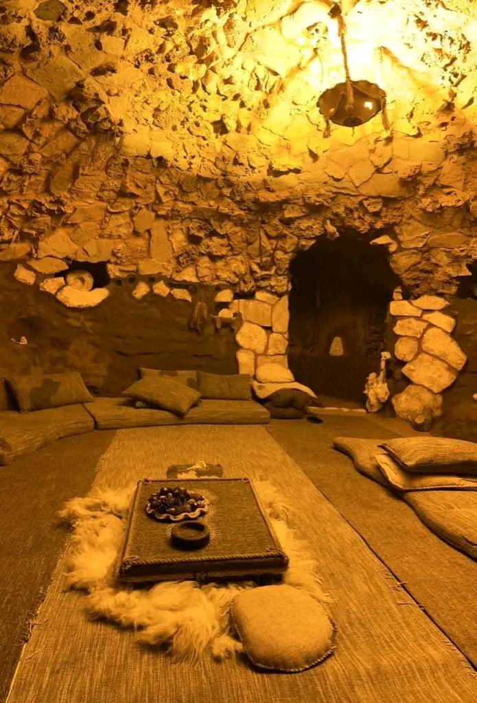 يقود المسار إلى باب خشبي متين بمجرد فتحه تُطل تفاصيل تجمع بين الحياة البدائية ورحلات تطور الإنسان، عنصرها الرئيسي تشكيلات حجرية موزعة تشبه التجويفات المتسلسلة في كهف متناسق القطع الأثرية والتراثية غايته اختزال رحلة زمنية تكفل الصفاء الذاتي والاسترخاء النفسي والتأمل.