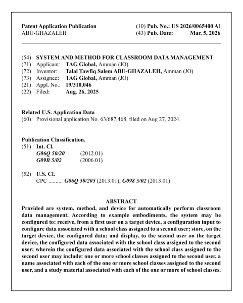 حصدت مجموعة طلال أبوغزاله العالمية الرقمية على براءة اختراع أمريكية جديدة من مكتب البراءات الأمريكي، تحت عنوان "System for Classroom Data Management”، وذلك عن نظام الحقيبة الذكية (Tag-Tab EBook).